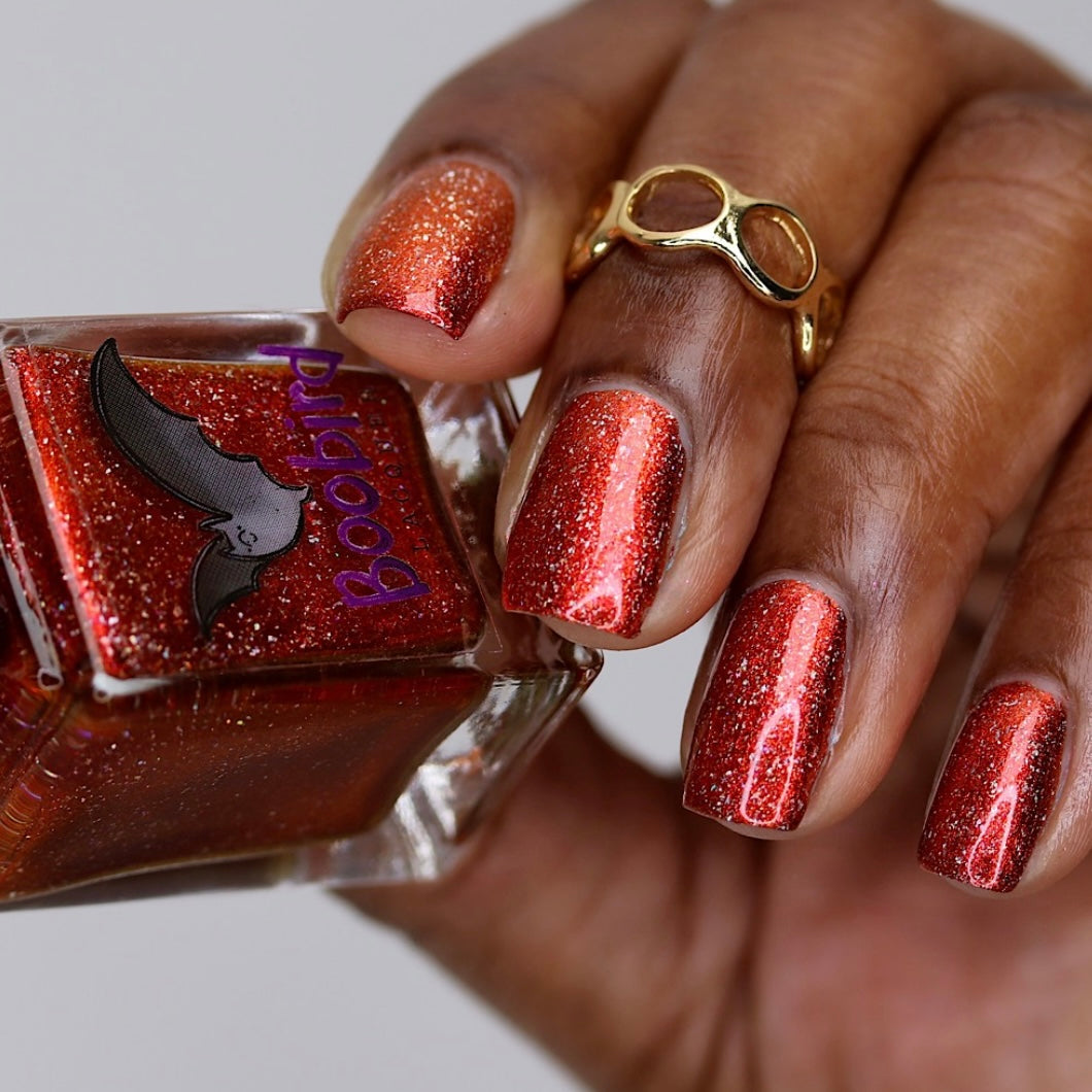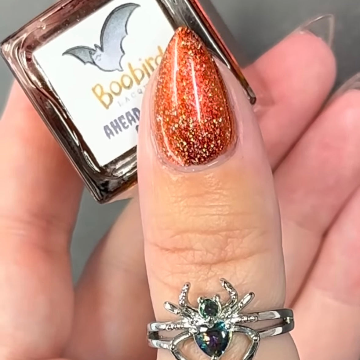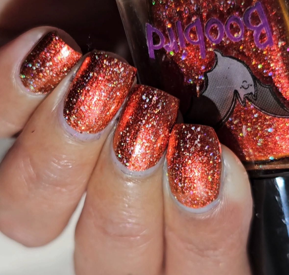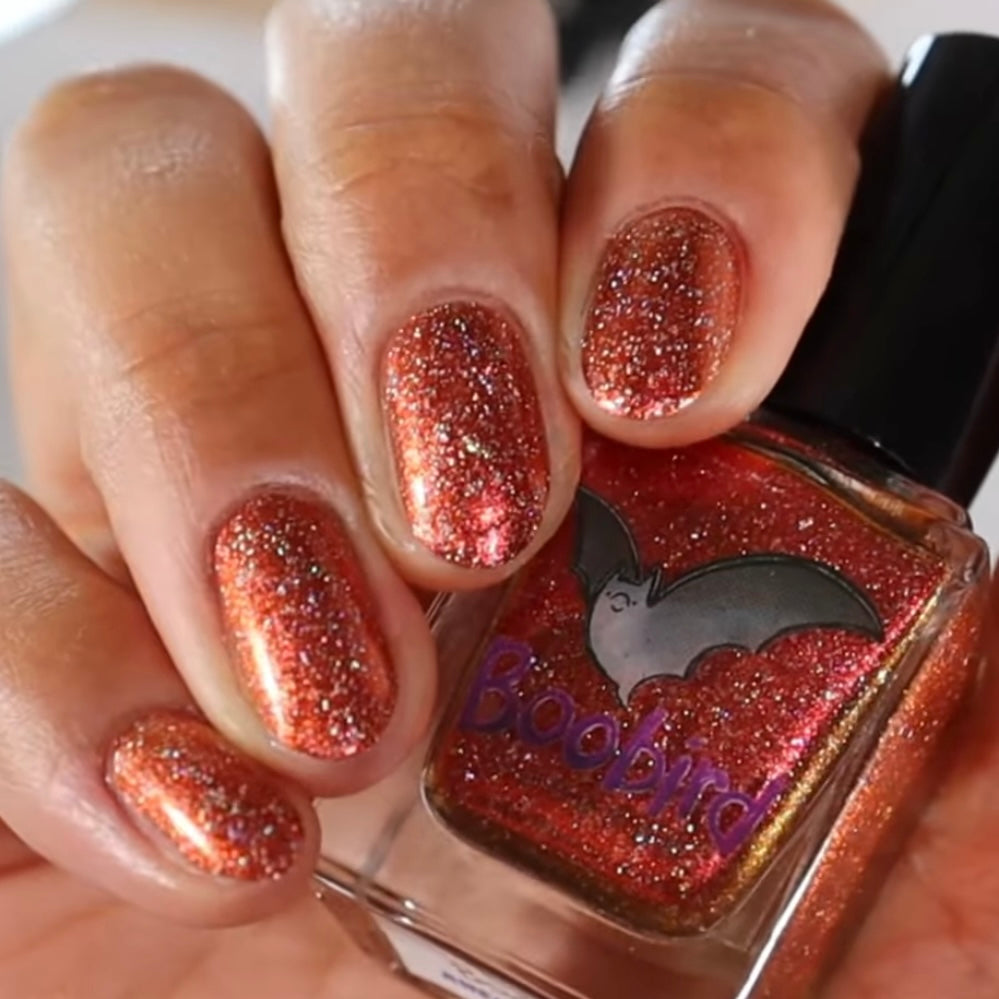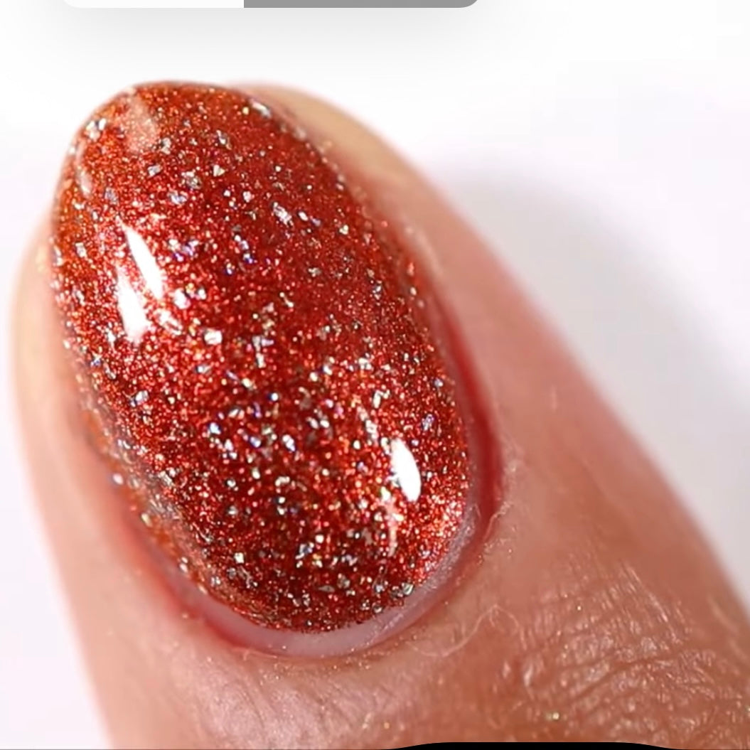 An orange red shifting glowy multi chrome with a scattered shattered holo
