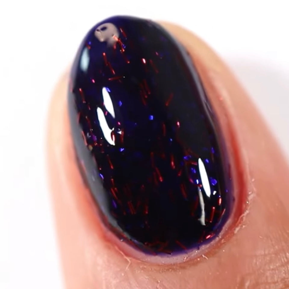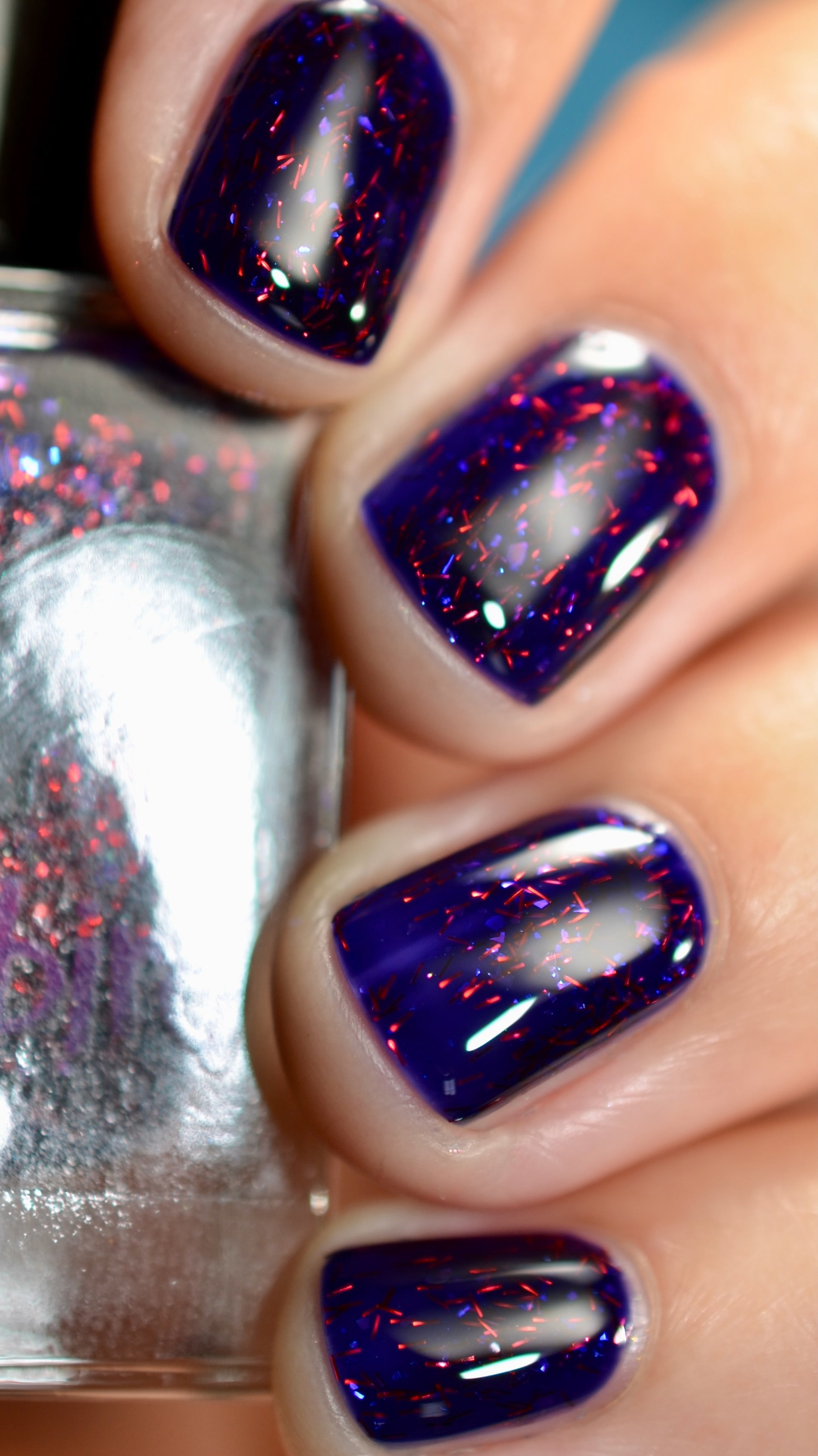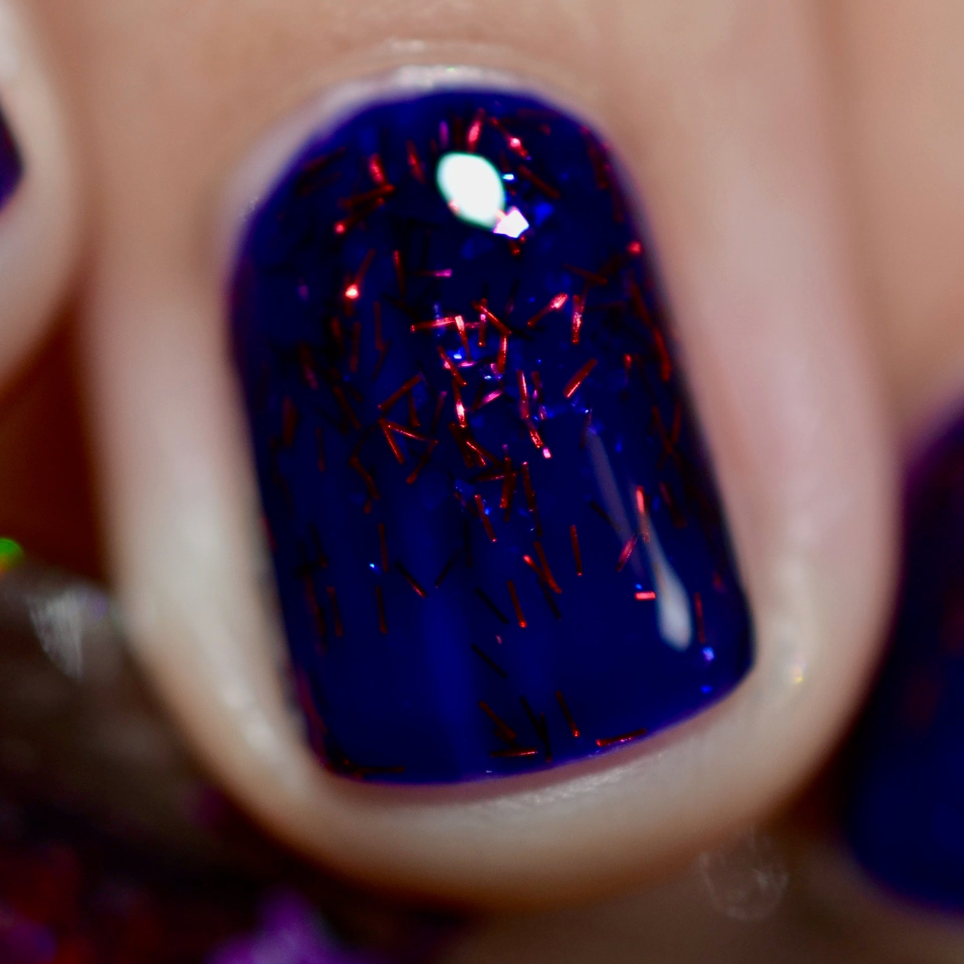 A dark violet jelly packed with red bar glitter and a scattering of violet micro flakes