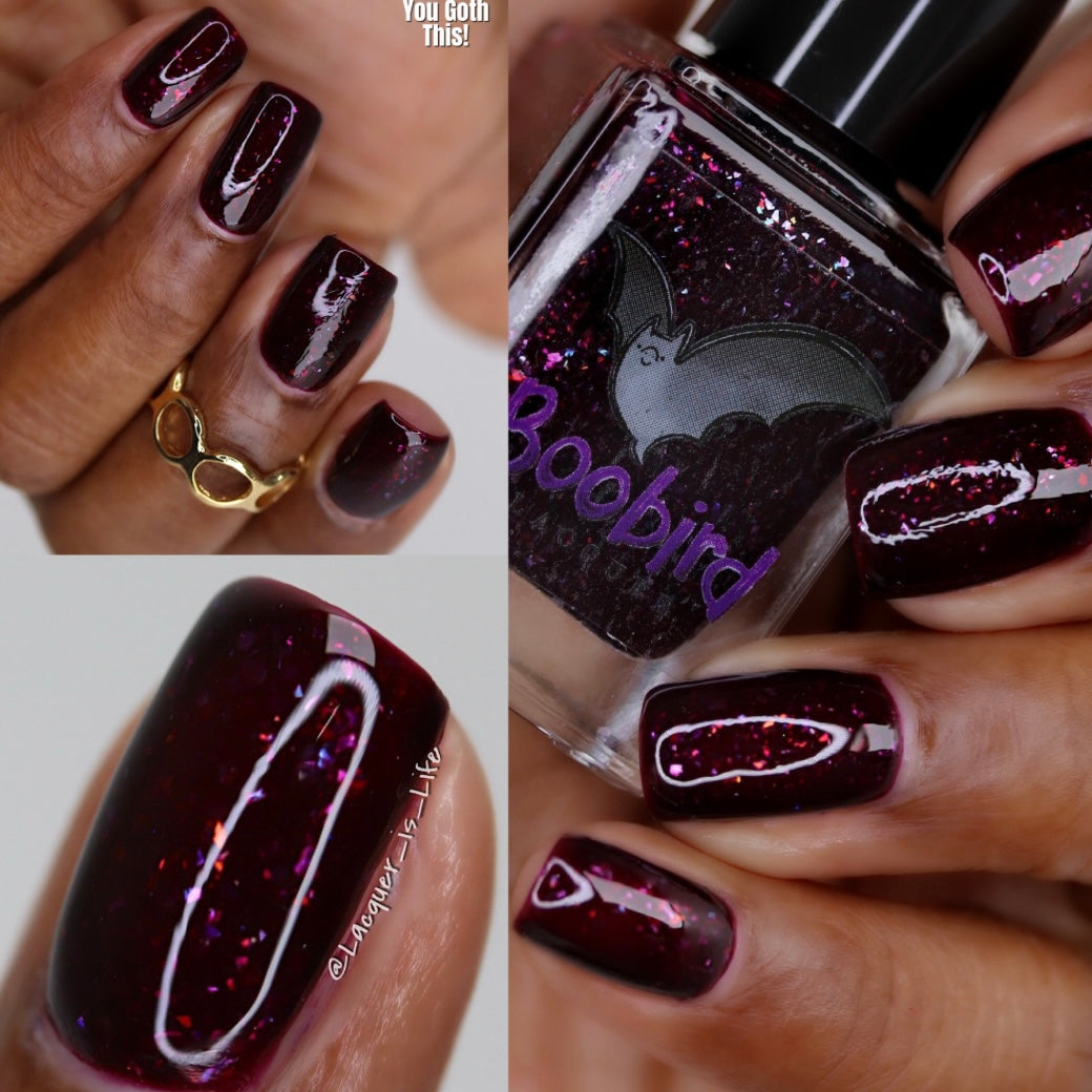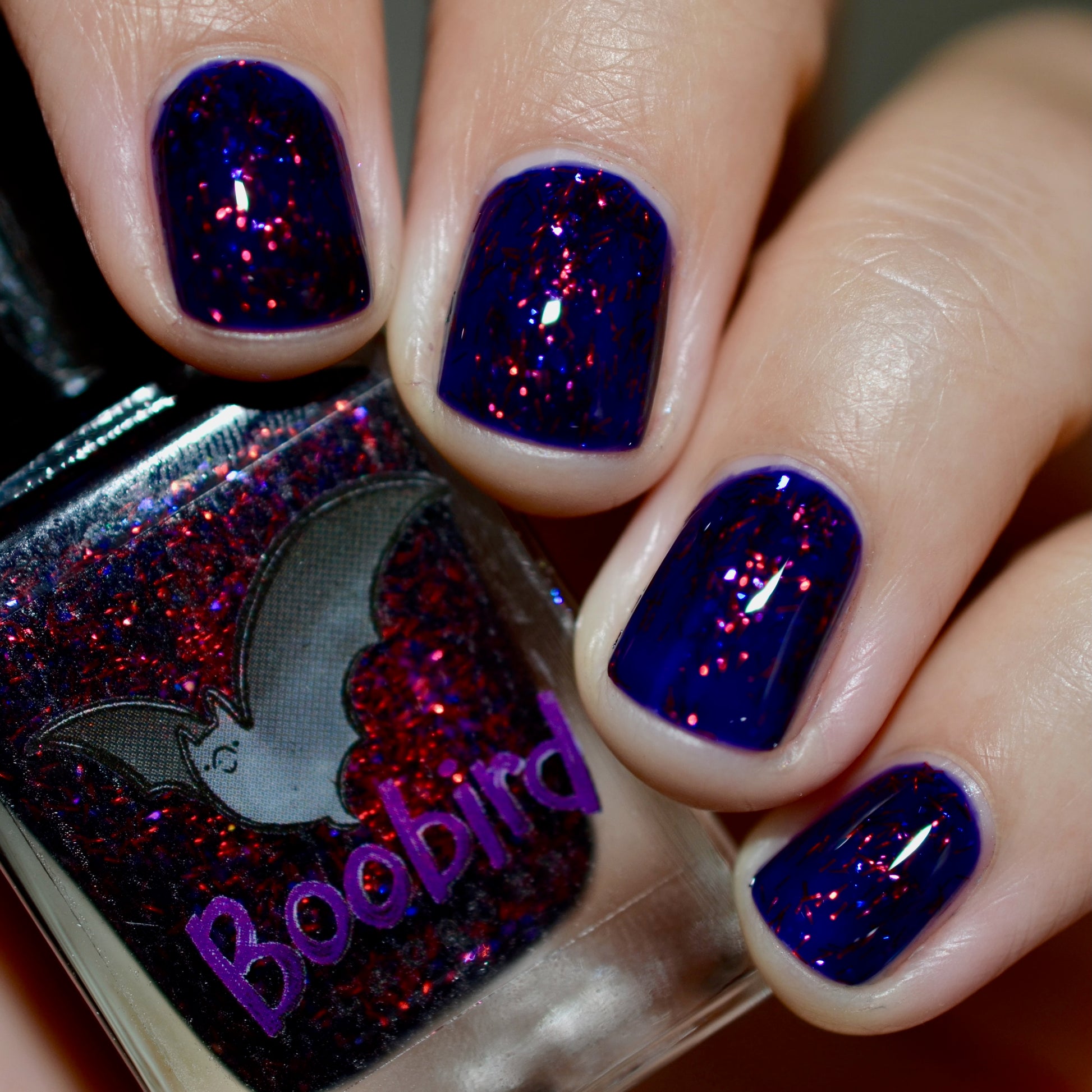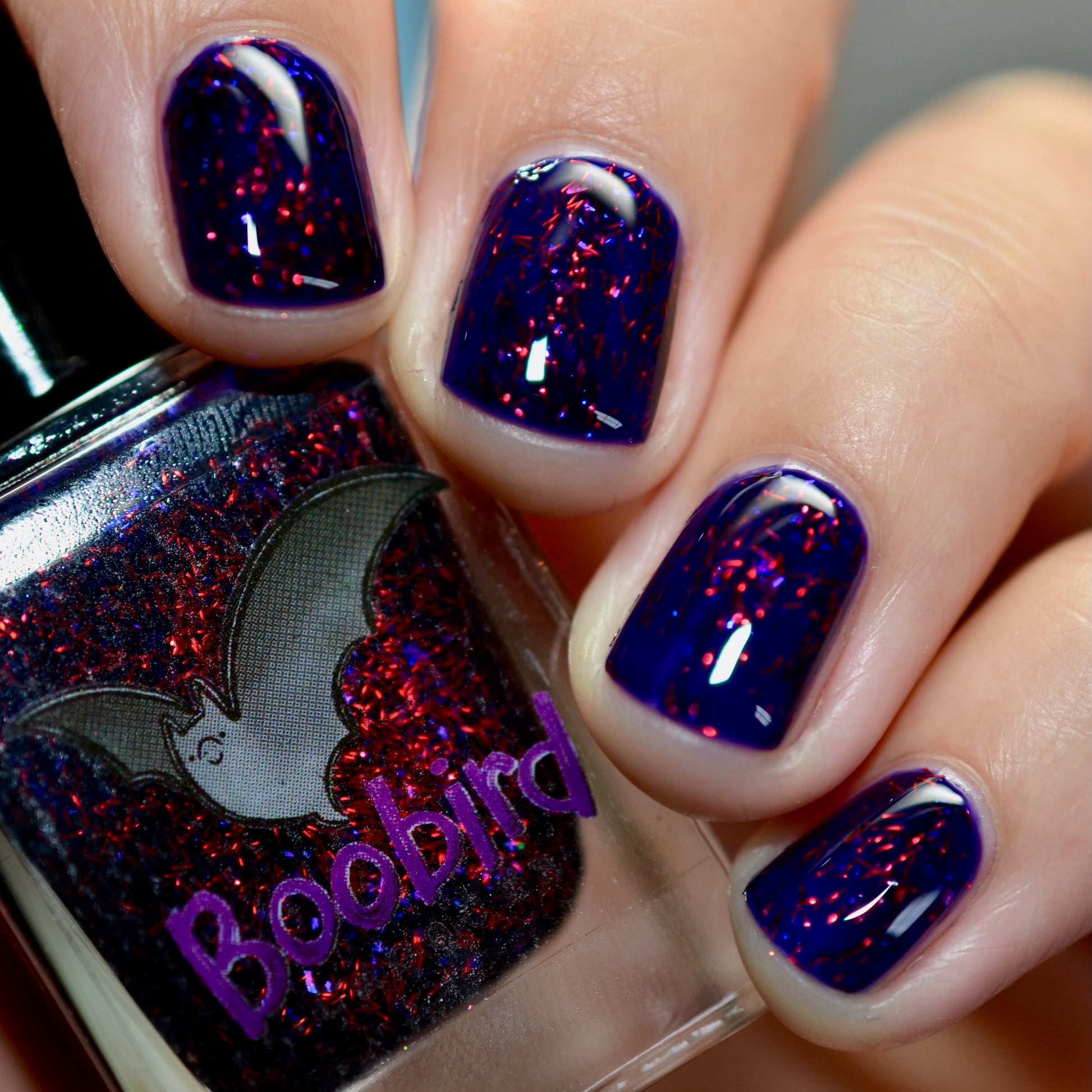 A dark violet jelly packed with red bar glitter and a scattering of violet micro flakes