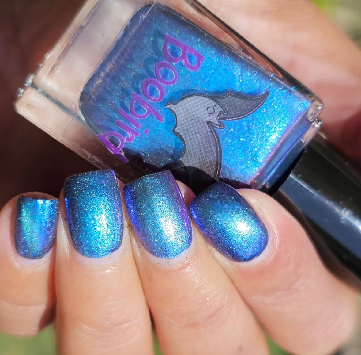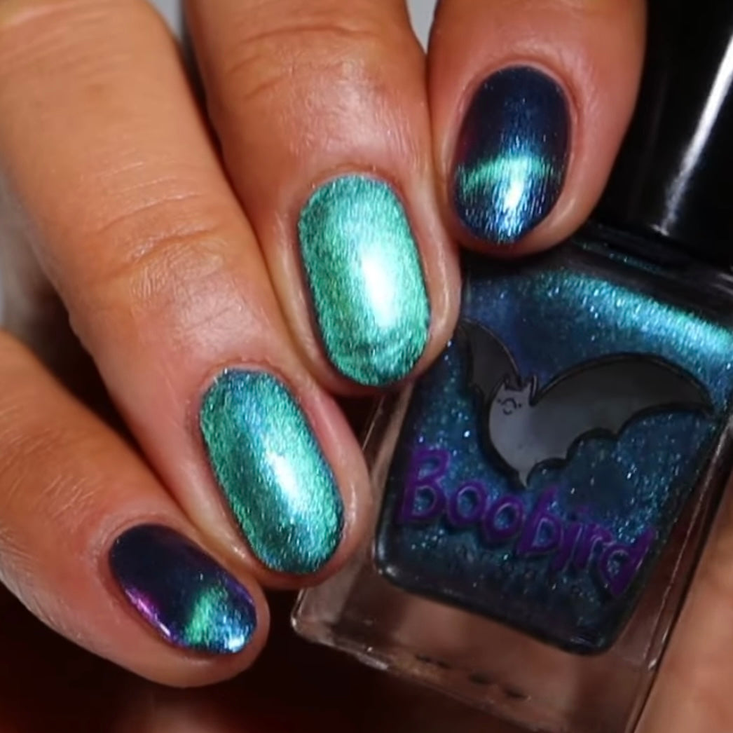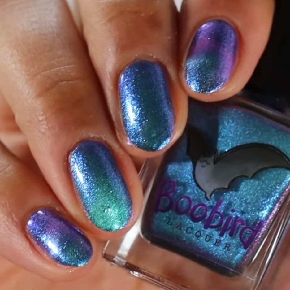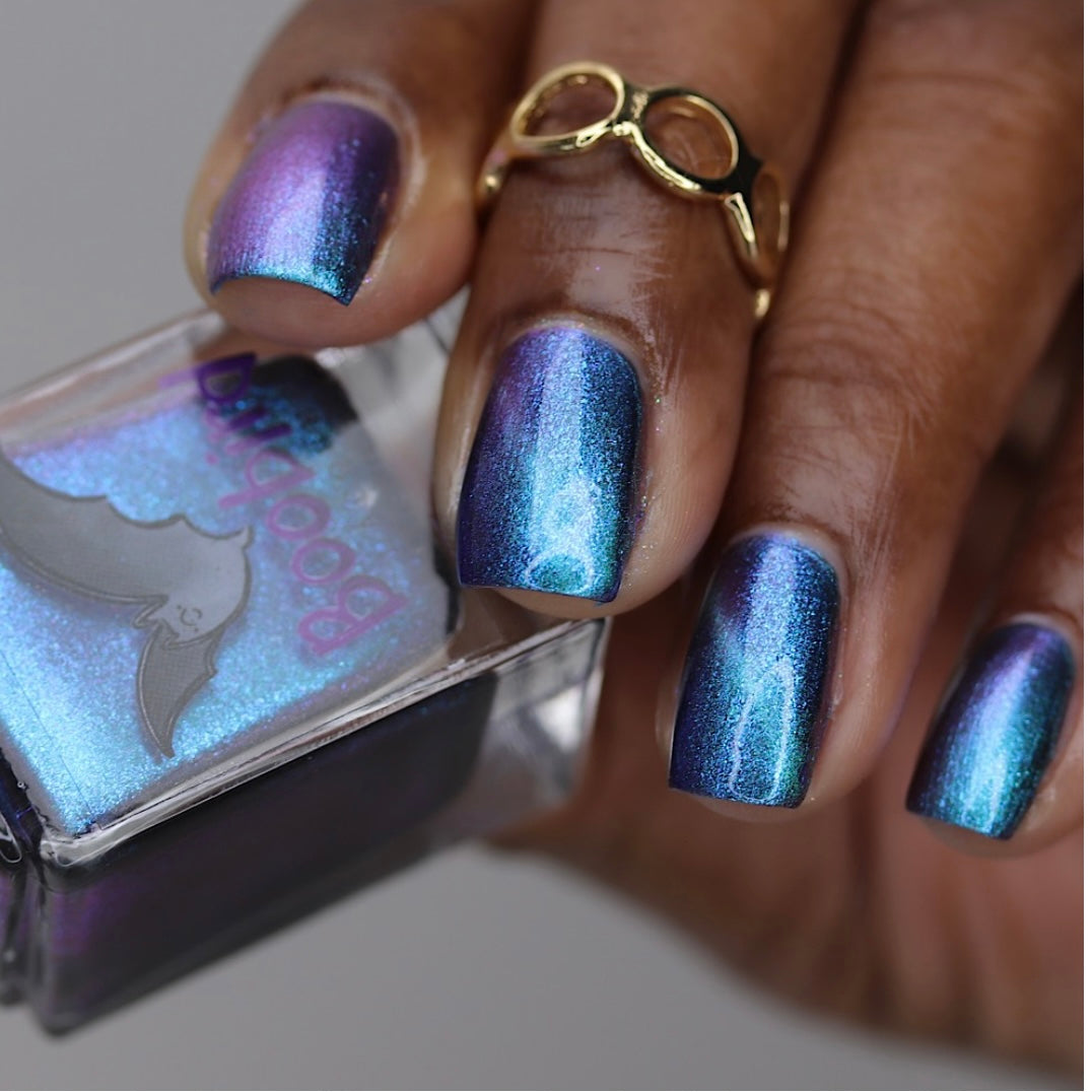 A magnetic multi chrome that shifts cyan to purple with sparkly blue micro flakes