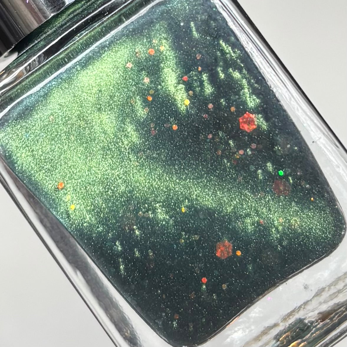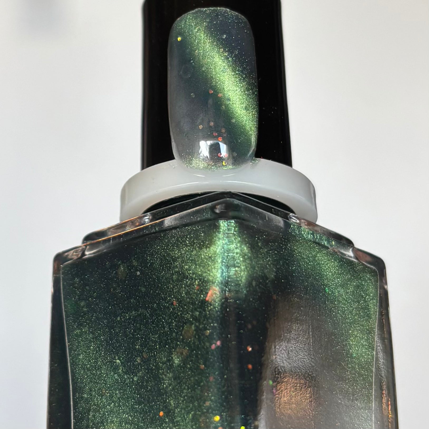 This is a light green magnetic full of iridescent red-orange-green-gold shifting glitter