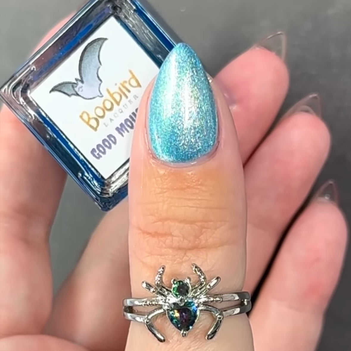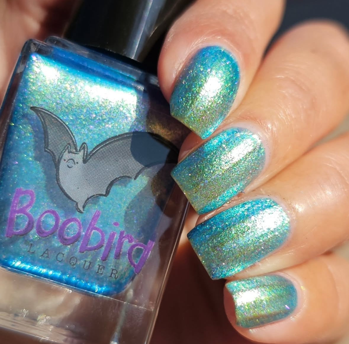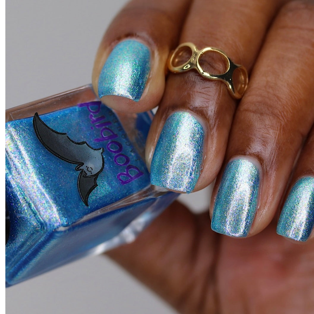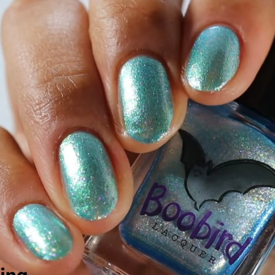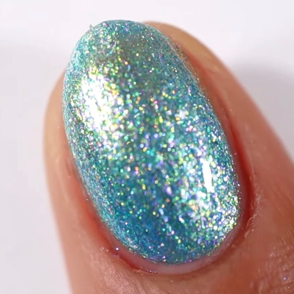 A light blue shimmer with purple and green sparkles. May cause a mild pink spotting on nails.